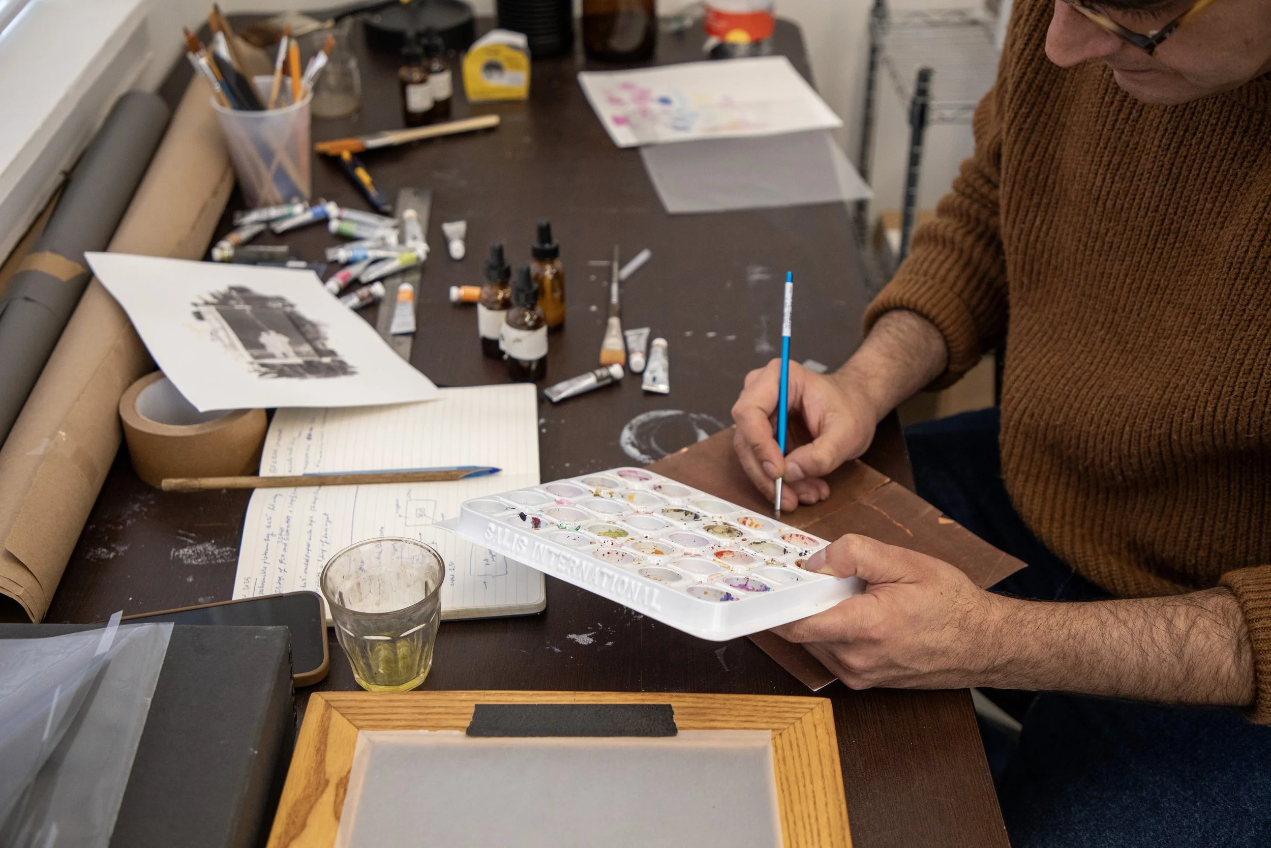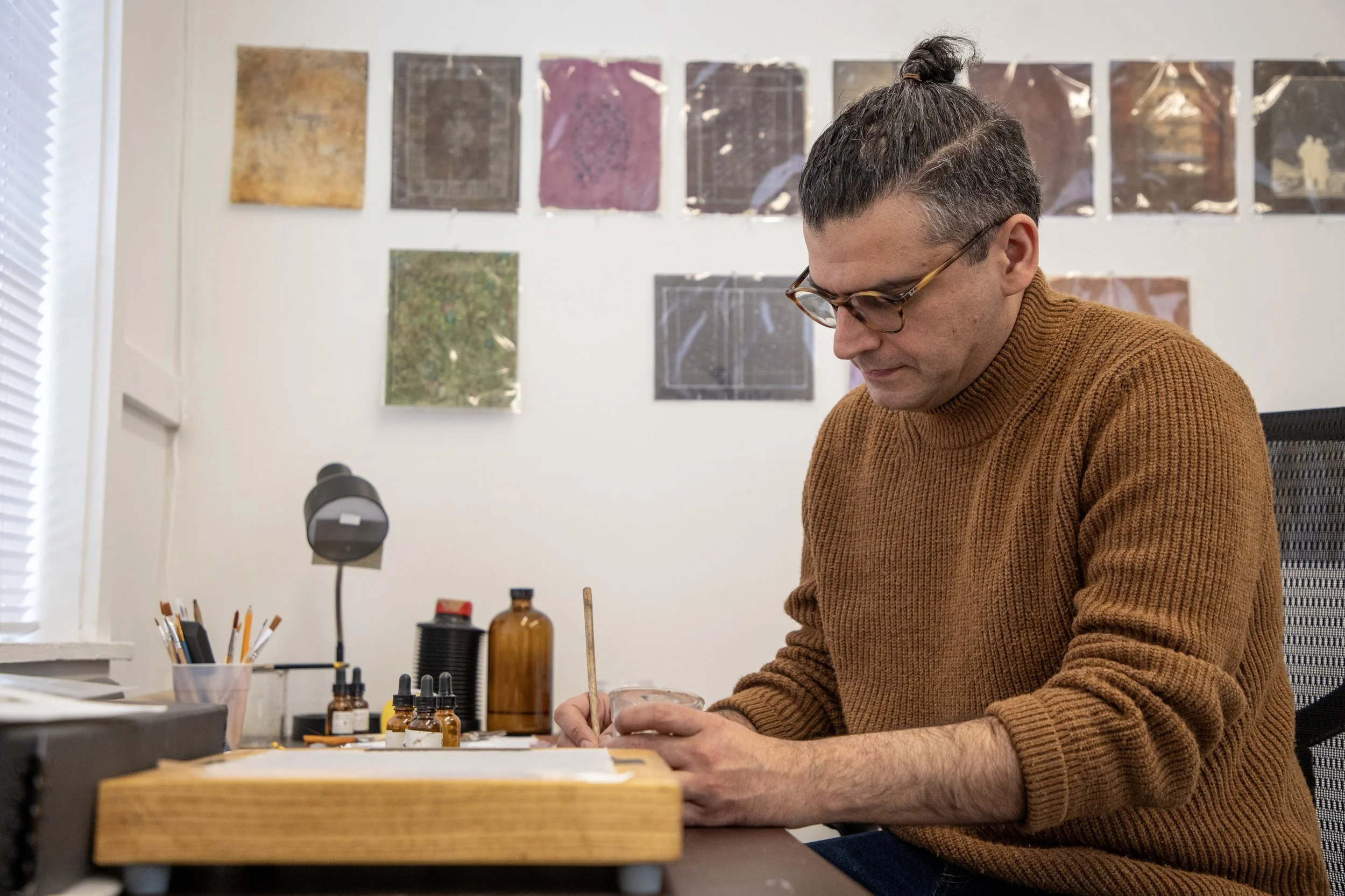 “During his residency at MASS MoCA, he investigated visual culture from the Qajar era, focusing on decorative marriage contract covers as both material and symbolic artifacts. Working with iron-silver printing, watercolor, and layered photographic techniques such as masking and multiple exposure, he worked with found and family archival images. The project reflects on how images endure through erasure and censorship, where missing or altered photographs are reimagined as a response to acts of censorship.”