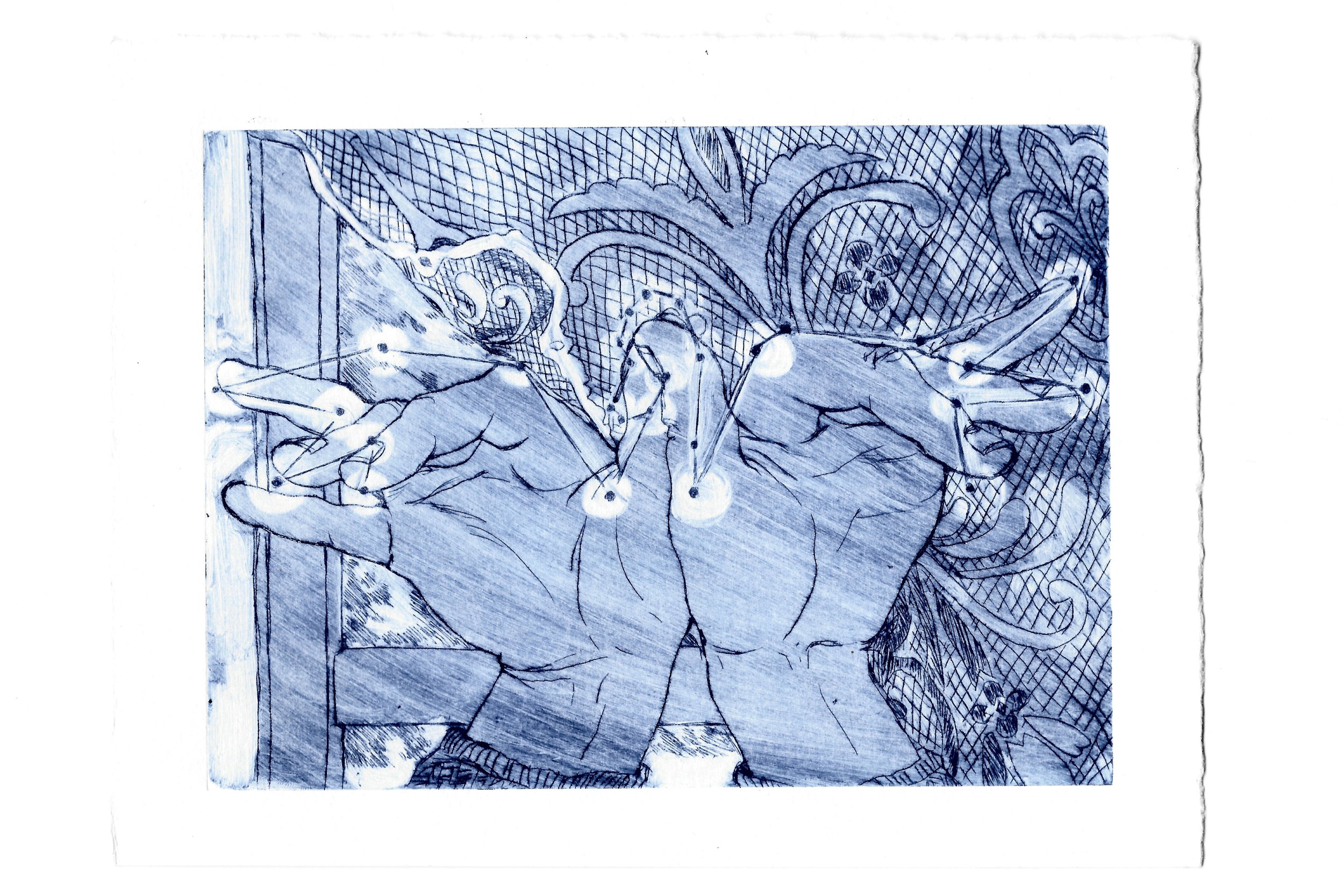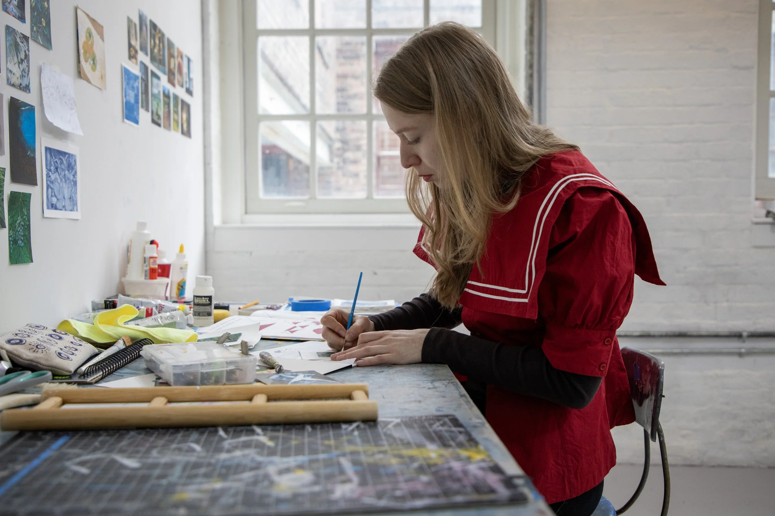 Between those two weeks, I was able to prep a few new paintings, work on some drawings, and even experiment with dry-point etching—a process I hadn’t considered integrating into my image-making practice at large, up until then. My favorite moments at the residence were when we’d run into each other at odd hours—whether it was at the print shop or mid-climb up to the artist apartments after some late-night work—it was so special to get to share this compressed period of making with artists and writers alike.”