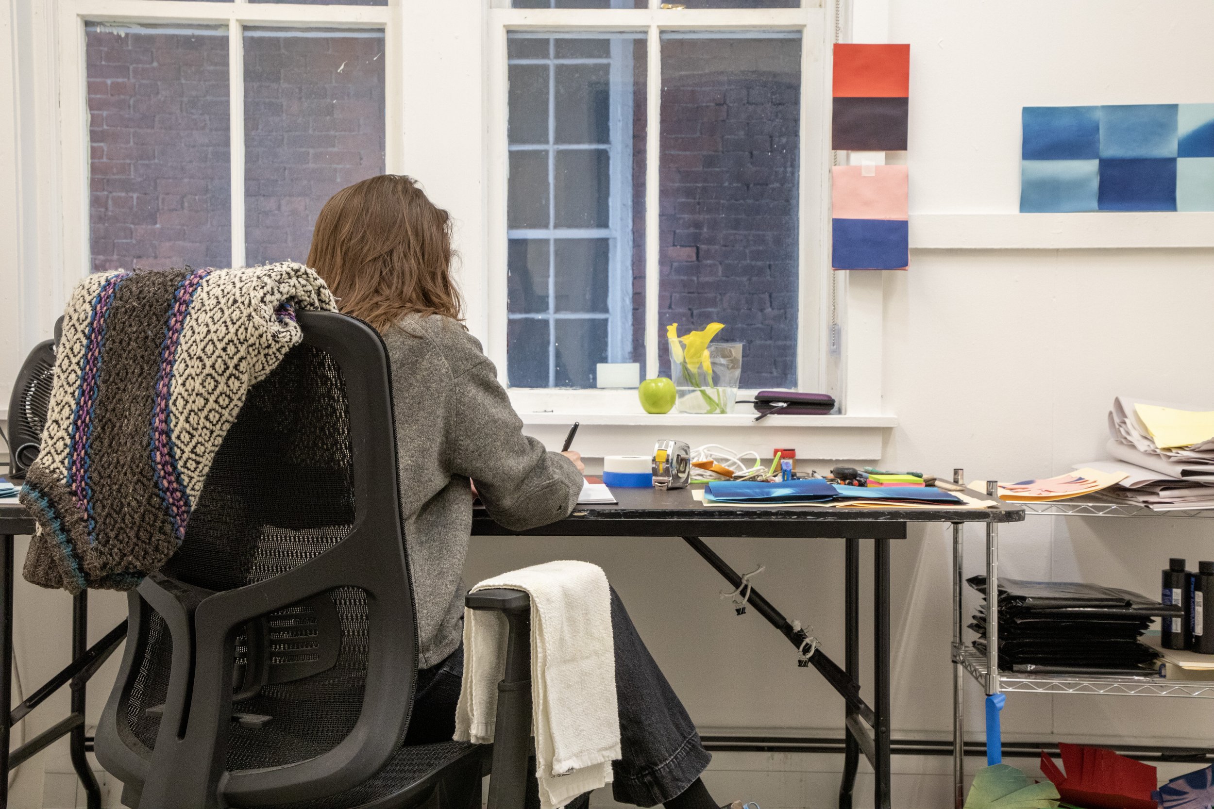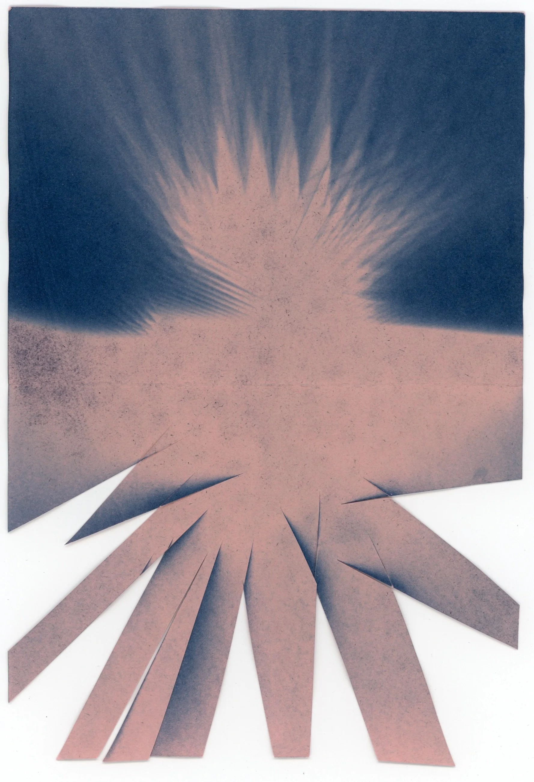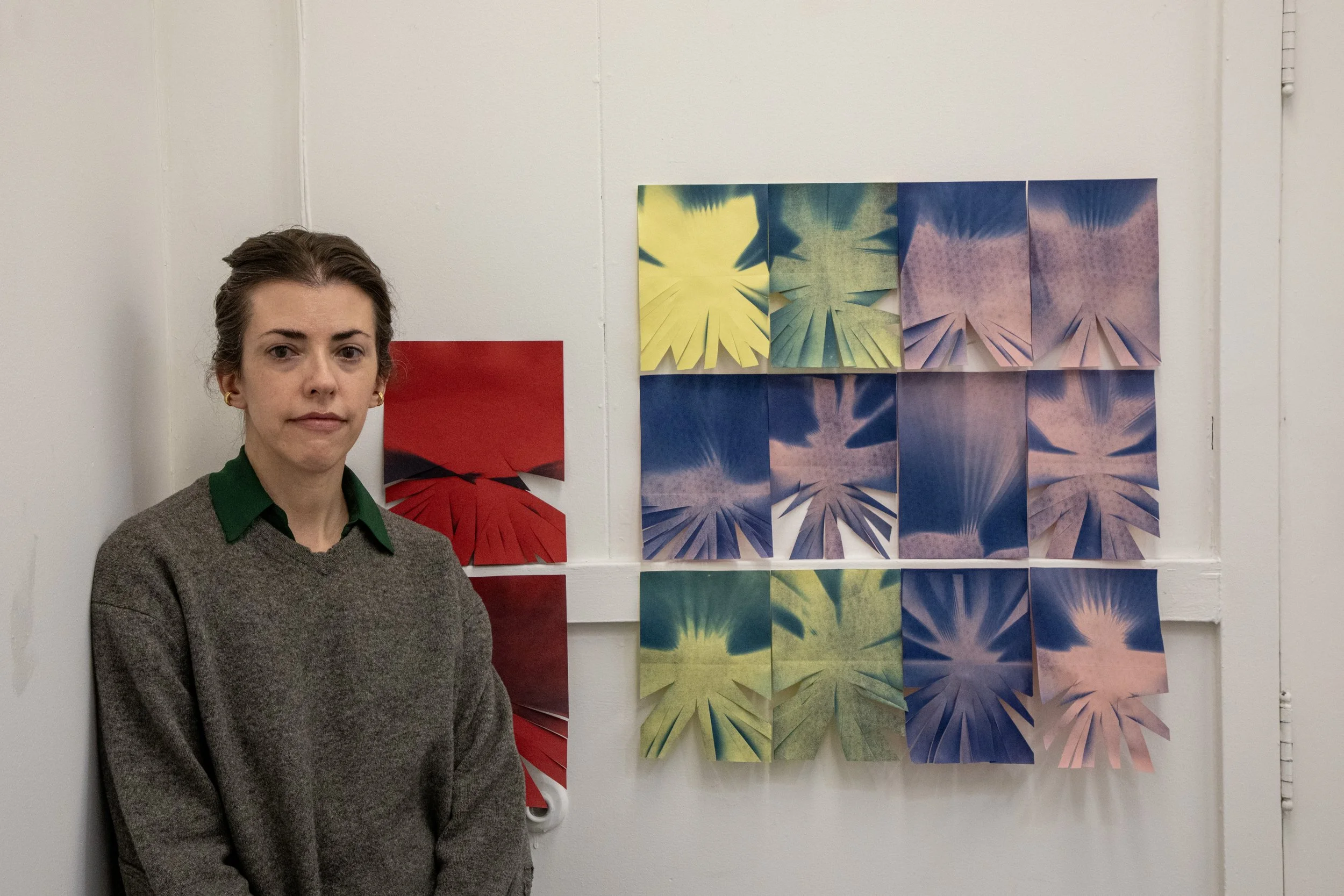 “I work with the cyanotype, an alternative photographic process that produces dark blue prints. Inspired by Froebel Gifts and the Rosner Perceptual Skills Curriculum (hands-on teaching and learning experiences meant to be utilized in elementary schools) during my residency I experimented with the intersections between the cyanotype and simple paper-related gestures like folding, scoring, crumpling, ripping, and cutting. I visited the museum, specifically the James Turrell works, each day, attended an incredible performance by Robin Frohardt, and watched the mountains and weather, especially the falling snow.”