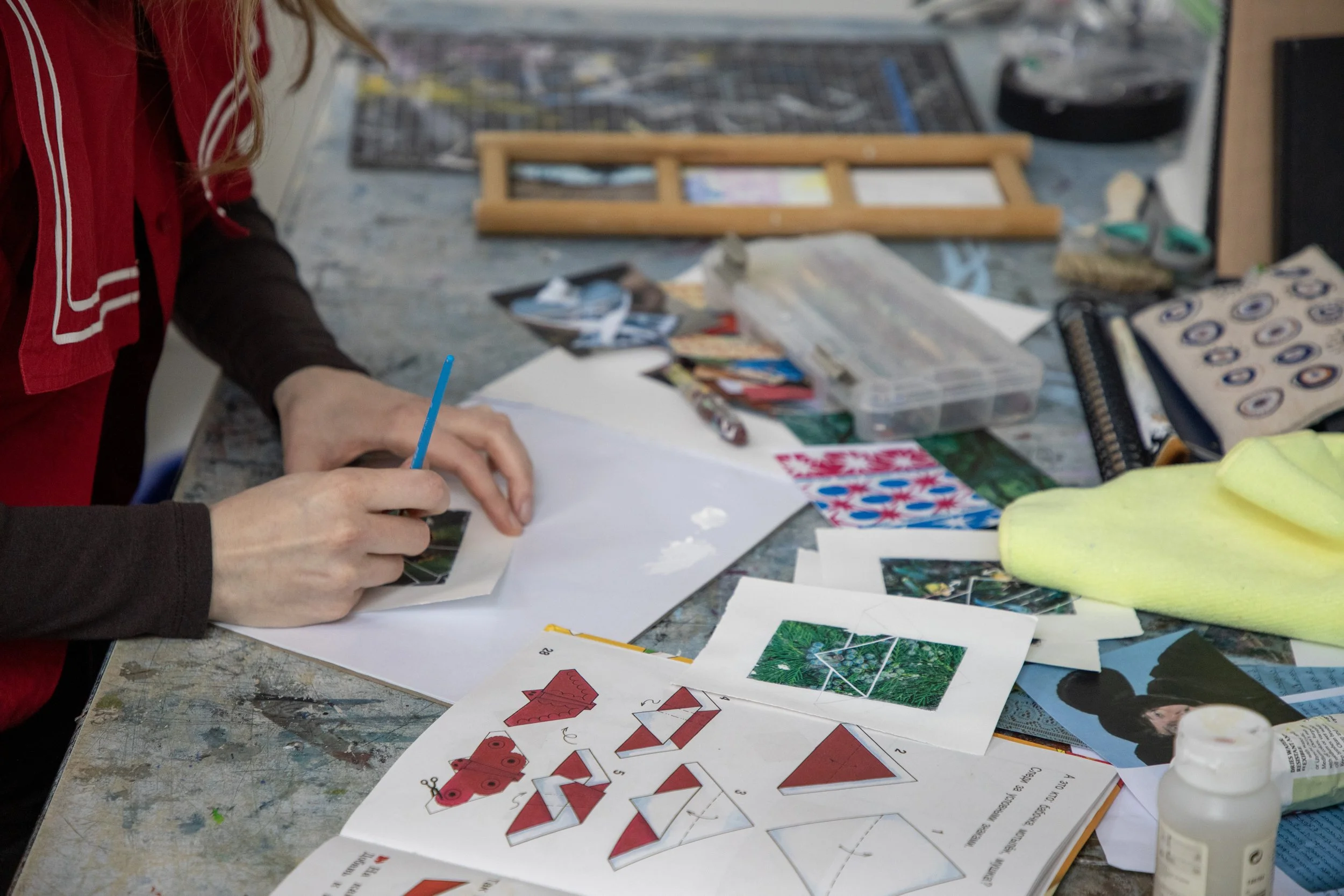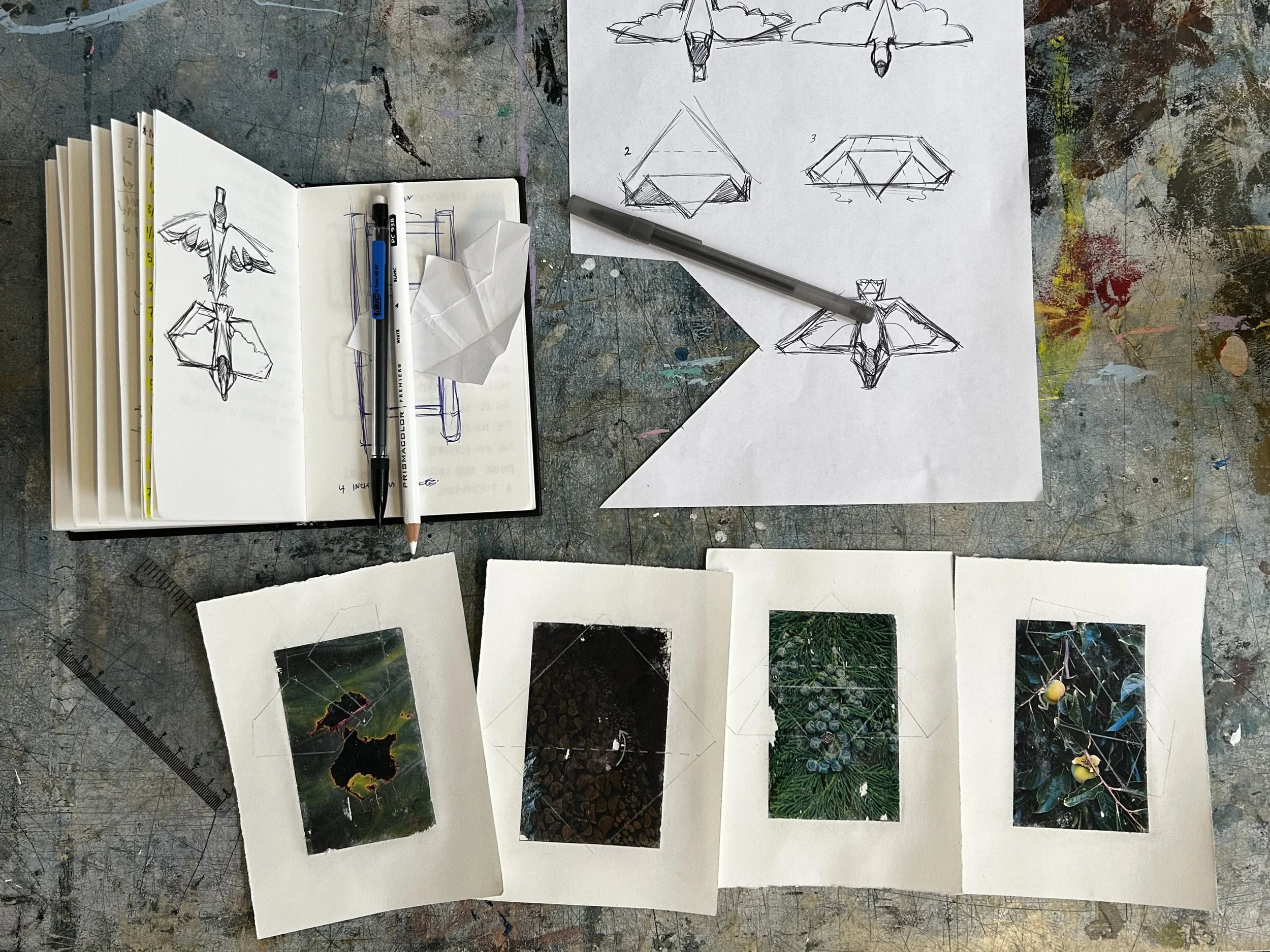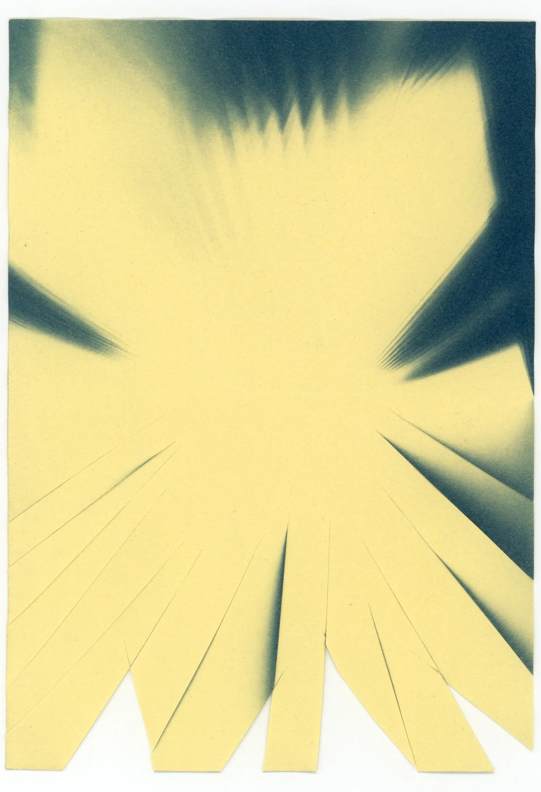 “I work with the cyanotype, an alternative photographic process that produces dark blue prints. Inspired by Froebel Gifts and the Rosner Perceptual Skills Curriculum (hands-on teaching and learning experiences meant to be utilized in elementary schools) during my residency I experimented with the intersections between the cyanotype and simple paper-related gestures like folding, scoring, crumpling, ripping, and cutting. I visited the museum, specifically the James Turrell works, each day, attended an incredible performance by Robin Frohardt, and watched the mountains and weather, especially the falling snow.”